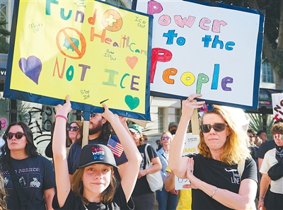 不久前,人们在美国加利福尼亚州洛杉矶市政厅前手举标语参加示威活动,抗议美国联邦当局对移民暴力执法。 曾 慧摄(新华社发)